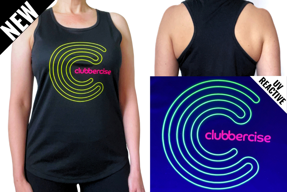 Fitted, breathable black racerback tank top with neon yellow and neon pink print that glows under UV light.