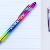 Stylish ballpoint pen with a metallic rainbow effect barrel, white Clubbercise logo, silver trims and black ink.