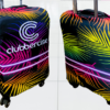 Fabric suitcase cover that stretches to fit various small suitcases (cabin-sized, 18”-22” tall). Printed with environmentally friendly water-based inks. Handmade in the UK.