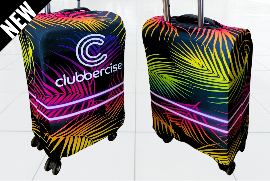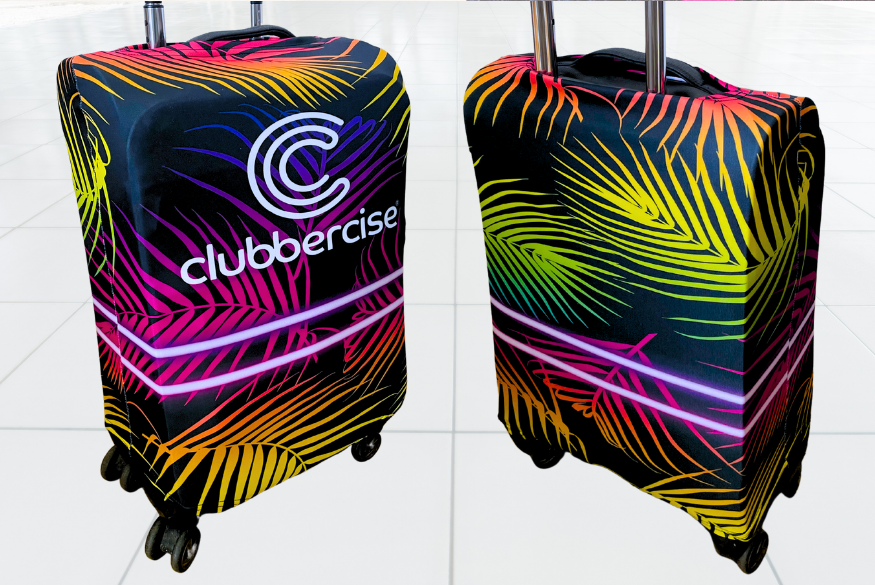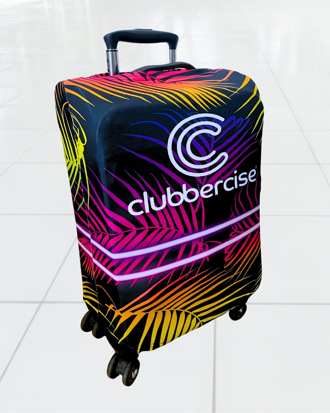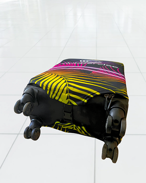 Fabric suitcase cover that stretches to fit various small suitcases (cabin-sized, 18”-22” tall). Printed with environmentally friendly water-based inks. Handmade in the UK.