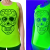 Fitted, breathable black racerback tank top with neon green skull print. Glows under UV light.