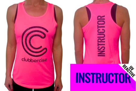 Fitted, breathable, UV-reactive electric pink racerback tank top with a multicoloured Clubbercise logo on the front and multicoloured ‘Instructor’ print on the back.