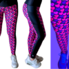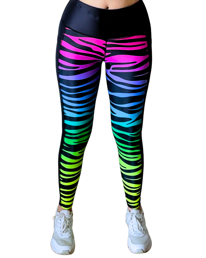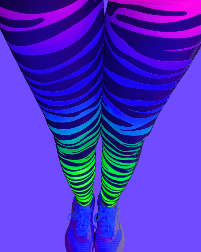 Bold, high-performance leggings featuring a vibrant UV reactive neon zebra stripe gradient in purple, pink, blue, and green.