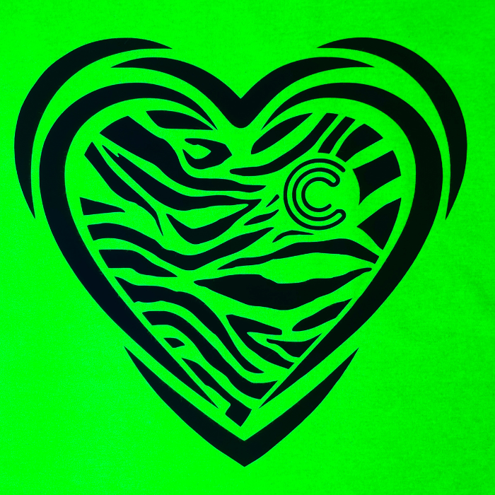 A black sweatshirt, brushed inner fleece and ribbed cuffs and hem, with UV-reactive pink HEART print on the front and ‘clubbercise’ print on the back.