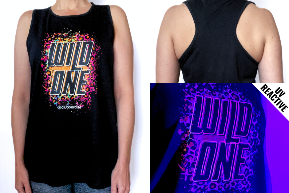 Fitted, breathable black racerback tank top with neon yellow and neon pink print that glows under UV light.